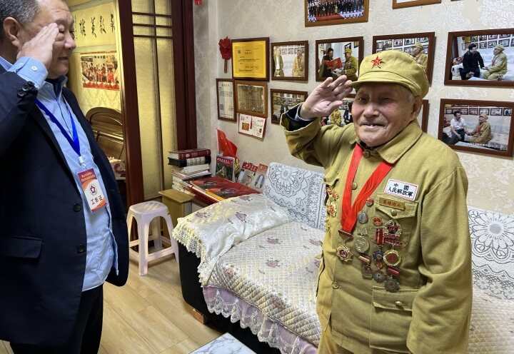眾人靜靜地聽著,臉上滿是崇敬。時間過得飛快,轉(zhuǎn)眼間到了要告別的時刻。促進會代表們紛紛與老人握手道別,“張老,您一定要保重身體,我們明年還來看您?!崩先司o緊握著大家的手,眼中滿是感激:“謝謝你們,祝你們工作順利,新年快樂!”臨別前,老人與代表互敬軍禮!